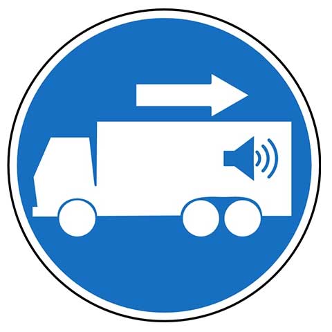 Gebodspictogram achteruitrijsignaal. Gebruik deze sticker om aan te geven dat je moet oppassen als het achteruitrij signaal klinkt. De sticker is geschikt voor zowel binnen- als buitengebruik. Kies bij buitengebruik de optie “beschermfolie” voor extra bescherming tegen UV straling en water (en dus een langere levensduur).