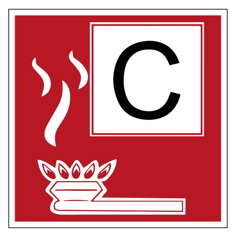 Pictogram Brandklasse C. Materiaal: vinylsticker voor binnen- en buitengebruik. Kies voor de optie “kraswerende beschermlaag” (laminaat) in het bestel menu voor extra lange levensduur. Deze sticker valt onder de internationale ISO 7010 normering.