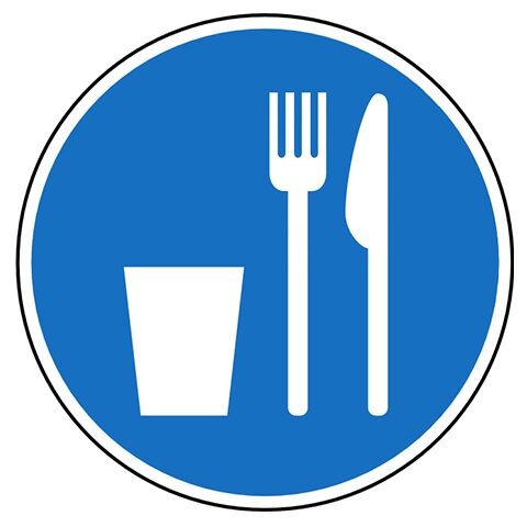 Gebodspictogram eetplaats. Gebruik deze sticker om aan te geven waar er binnen het gebouw gegeten mag worden, bijvoorbeeld de kantine. De sticker is geschikt voor zowel binnen- als buitengebruik. Kies bij buitengebruik de optie “beschermfolie” voor extra bescherming tegen UV straling en water (en dus een langere levensduur).