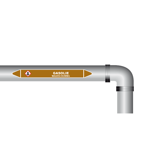 Leidingmarkering voor gasolie. Gebruik deze sticker om aan te geven welke leiding als gasolie gemarkeerd moet worden. Te gebruiken in ruimtes met ontvlambare vloeistoffen leidingen, bijvoorbeeld een raffinaderij en tank platformen. De sticker is geschikt voor zowel binnen- als buitengebruik. Kies bij buitengebruik de optie “beschermfolie” voor extra bescherming tegen UV straling en water (en dus een langere levensduur).