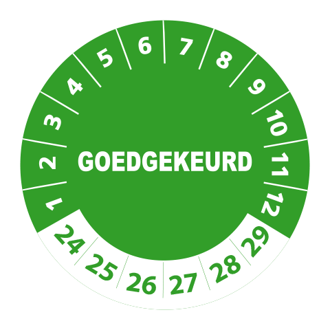 Bestel hier uw ronde ’goedgekeurd 2024′ stickers met datum op makkelijk hanteerbare rollen. De keuringsstickers hebben een diameter van 3 cm en worden geleverd met een UV beschermlaag. Ze zijn daarom ook geschikt voor outdoor gebruik en kunnen prima tegen een stootje. Heeft u speciale wensen? Bel of mail dan gerust voor een offerte op maat!