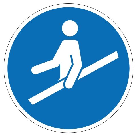 M012 leuning vasthouden. Gebruik deze sticker om aan te geven dat het verplicht is om de leuning vast te houden. (NEN ISO 7010). De sticker is geschikt voor zowel binnen- als buitengebruik. Kies bij buitengebruik de optie “beschermfolie” voor extra bescherming tegen UV straling en water (en dus een langere levensduur).