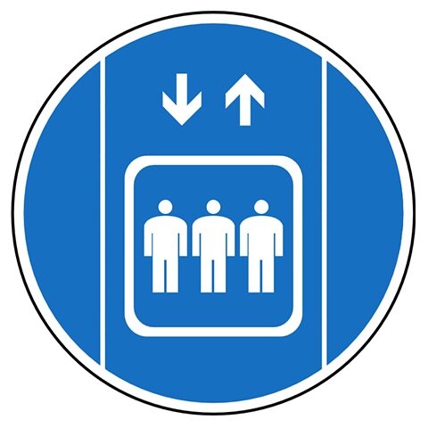 Gebodspictogram lift. Gebruik deze sticker om aan te geven dat het verplicht is om de lift te gebruiken. De sticker is geschikt voor zowel binnen- als buitengebruik. Kies bij buitengebruik de optie “beschermfolie” voor extra bescherming tegen UV straling en water (en dus een langere levensduur).