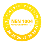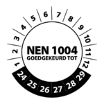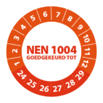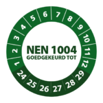 Bestel hier uw ‘NEN 1004 goedgekeurd tot 2024’ keuringsstickers op makkelijk hanteerbare rollen. De stickers hebben een diameter van 3 cm en worden geleverd met een UV beschermlaag. Ze zijn daarom ook geschikt voor outdoor gebruik en kunnen prima tegen een stootje. Heeft u speciale wensen? Bel of mail dan gerust voor een offerte op maat!