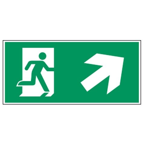 Vluchtweg omhoog rechts pictogram. Gebruik deze sticker om aan te geven dat je voor de vluchtweg naar rechtsboven moet. De sticker is geschikt voor zowel binnen- als buitengebruik. Kies bij buitengebruik de optie “beschermfolie” voor extra bescherming tegen UV straling en water (en dus een langere levensduur).