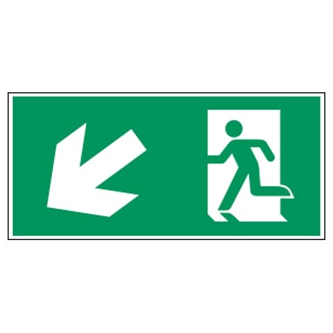 Vluchtweg omlaag links pictogram. Gebruik deze sticker om aan te geven dat je voor de vluchtweg naar linksonder moet. De sticker is geschikt voor zowel binnen- als buitengebruik. Kies bij buitengebruik de optie “beschermfolie” voor extra bescherming tegen UV straling en water (en dus een langere levensduur).