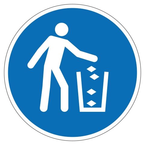 M030 vuilnisbak. Gebruik deze sticker om aan te geven dat het verplicht is om je vuilnis in de prullenbak te gooien. De sticker is geschikt voor zowel binnen- als buitengebruik. Kies bij buitengebruik de optie “beschermfolie” voor extra bescherming tegen UV straling en water (en dus een langere levensduur).