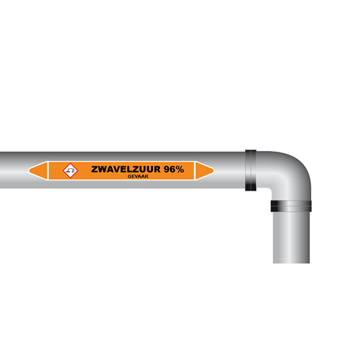 Leidingmarkering voor 96% zwavelzuur. Gebruik deze sticker om aan te geven welke leiding als 96% zwavelzuur gemarkeerd moet worden. Te gebruiken in ruimtes met zwavelleidingen, bijvoorbeeld bij een werkplaats of in de industrie. De sticker is geschikt voor zowel binnen- als buitengebruik. Kies bij buitengebruik de optie “beschermfolie” voor extra bescherming tegen UV straling en water (en dus een langere levensduur).
