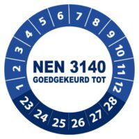 NEN 3140 stickers worden gebruikt voor het periodiek keuren van elektrische arbeidsmiddelen. Dit is een Nederlandse norm die alle relevante eisen bevat voor laagspanningsinstallaties.